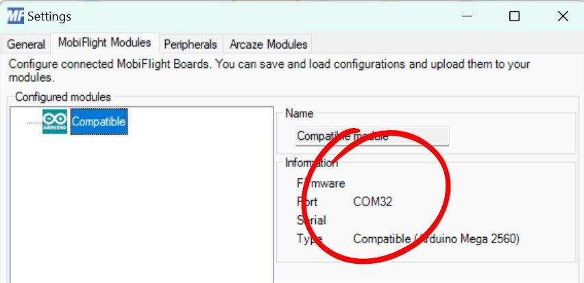 On MobiFlight Modules window, make note of the COM port number of the Compatible device: