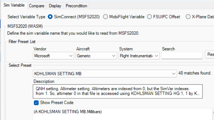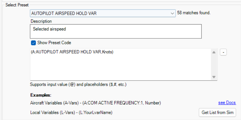MobiFlight comes pre-loaded with thousands of variables for MSFS, X-Plane and P3D. These are displayed on the drop-down menus and are called Presets.