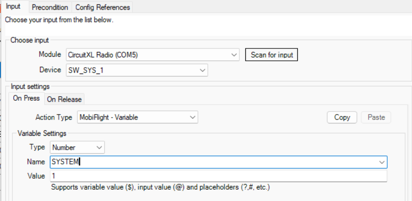 One example of this is the system selector used on the CircuitXL Radio Panel. When we make the selection, we aren't actually interacting with Flight Simulator. Instead, we are setting the value of a MobiFlight Variable called SYSTEM to either 1 or 2.